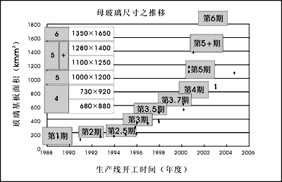 示图1 母玻璃尺寸在2001年第5期时(1200mm*1200mm级)、2002~2003年时第5+期(1100mm*1250mm级)及6期(1250mm*1650mm级)等尺寸的生产予预测速度。